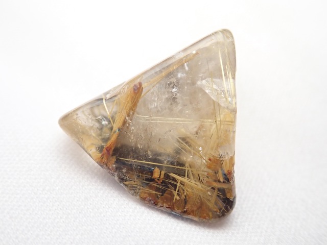 品名:ルチルクォーツ サイズ:17・14・5㎜ 重量:11.7ct 産地:ブラジル 備考:凹みやクラックの可能性があります、画像にてご確認くださいませ。 黒い内包物でヘマタイトがある場合もございます。 ルチルとは、二酸化チタンの結晶の一種です。 このルチルが針状に入り込んだ水晶をルチルクォーツと呼びます。 注意事項 ・画像の加工はしておりませんが照明の下で撮影しております。 また、色合いはモニター環境により変わることがあります。 ・天然石はヒビ・カケ・キズの可能性がございます、 天然石の特性とご承知の上ご購入願います。 トリートメント、処理のある石は備考にて記載致します。 ・小さな物も拡大して撮影しています、 硬貨との比較画像や表記のサイズをご参考くださいませ。