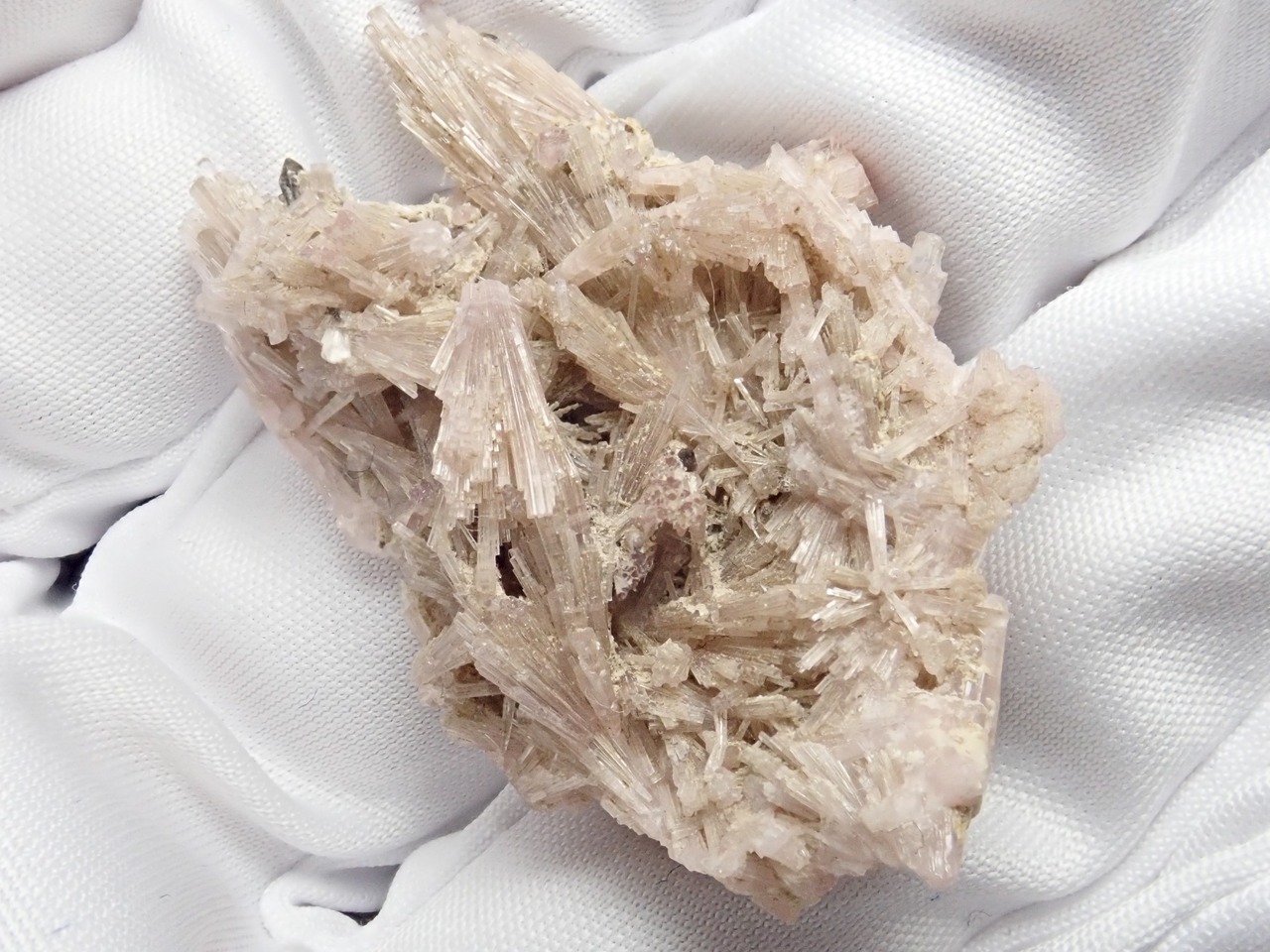 備考:ピンクの細いトルマリンたちが、扇状に結晶しています。