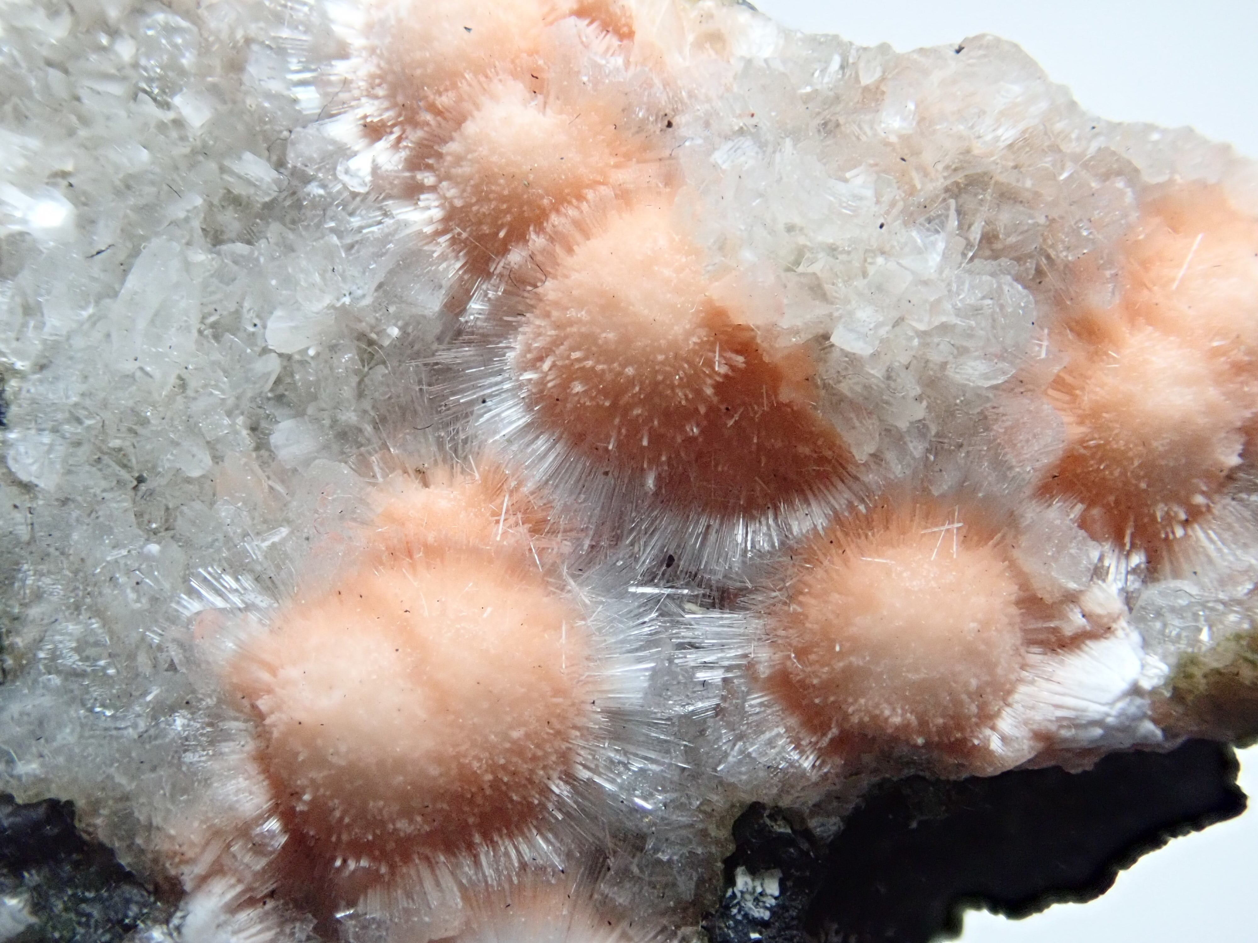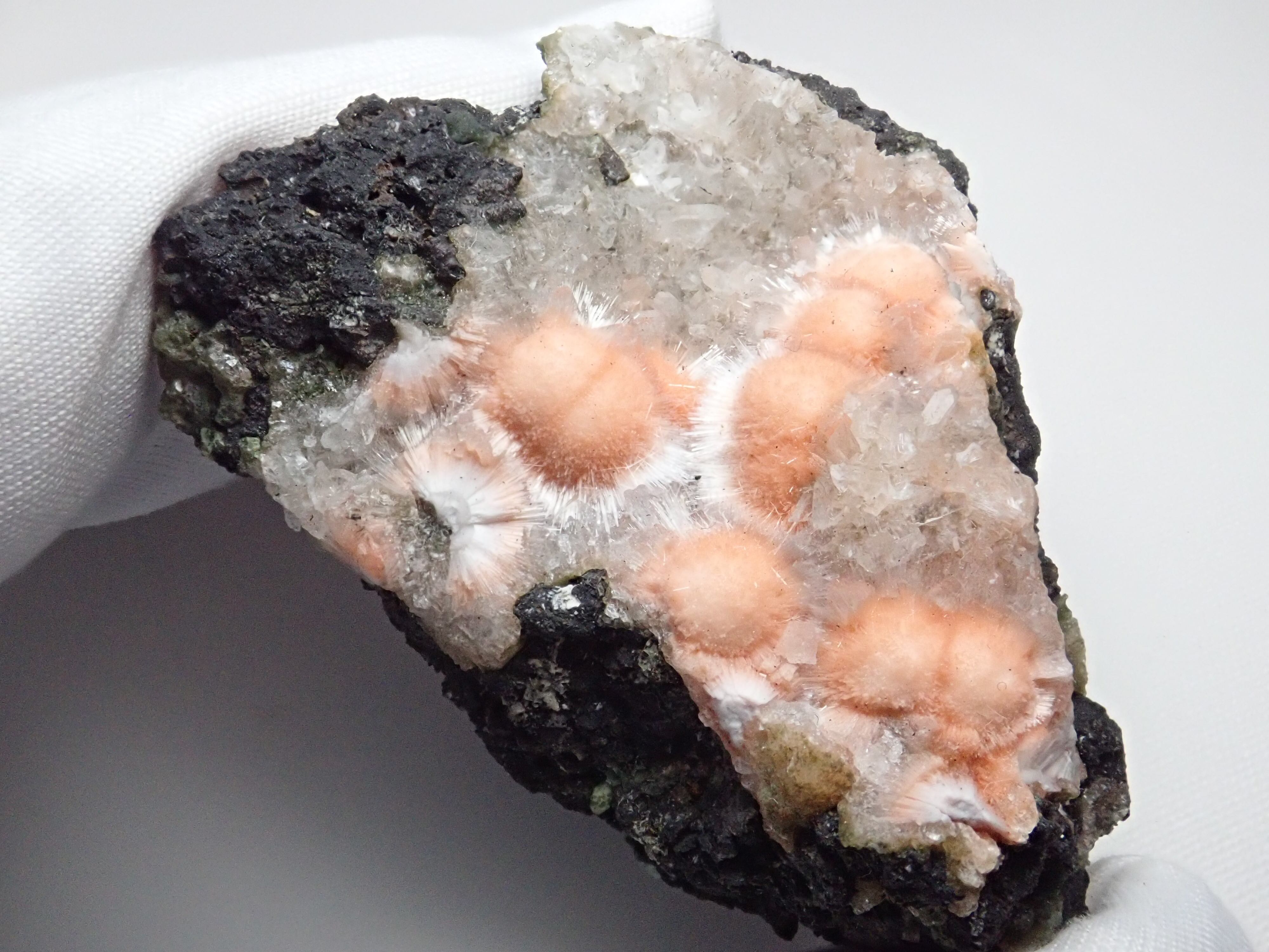 備考:オレンジのトムソナイトに白っぽい毛状メソライトが結晶しています。